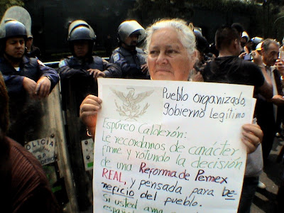 El hombre del momento llegó, como siempre una gran ovación se escuchó y los discursos comenzaron por parte de algunos integrantes del FAP; Ricardo Ruiz del PRD y el diputado Alejandro Chanona de Convergencia se dirigieron a la asamblea para agradecer estos meses de resistencia ante la intentona del gobierno usurpador de dar un albazo legislativo, mientras que Jorge Eduardo Navarrete, reconocido diplomático, resumió el contenido de cuatro documentos de exhaustivo análisis, realizados por más de cien expertos, acerca de la paraestatal mismos que se entregaron a al gobierno legítimo y a los grupos parlamentarios de FAP.